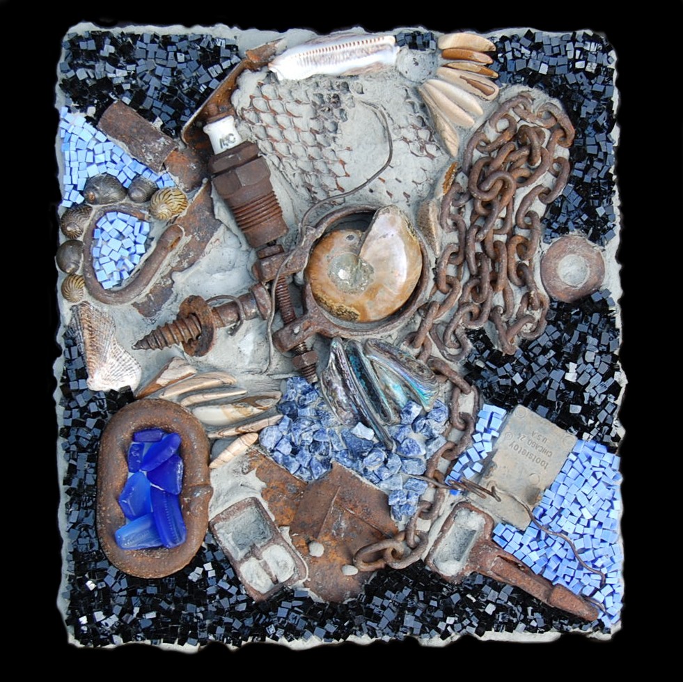 This work involves discarded, rusty, objects, as well as natural materials such as shells, fossils, and semi-precious stones. It addresses the conflict between humankind and the natural world. I am interested in exploring aesthetic judgments: are they objective, subjective; and should the intent of the artist, and/or the reaction of the viewer be a considered in determining these judgments. The rough cement adhesive I use becomes part of the composition, and serves as a metaphor for questioning the beauty of manmade materials. The found objects I incorporate into my work symbolize the detritus of our culture, suggesting that our insatiable appetites for consumerism cannot continue inexorably without having tremendous consequences on our planet. I use found wood as the substrate for my work, because it inspires me and carries the spirit of the tree from whence it came.