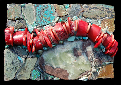 This is one of my most recent pieces, and I guess one that I am happy with. It is small, 5" x 7", but I spent about one month working on it. I started with the red coral element, but I tried so many materials and different things around the coral, I became really frustrated and thought I would never finish it. I chipped off so much cement and different materials, my fingers became sore. (Ahhh, the trials and tribulations of an artist) ; ) I guess sometimes you just need perserverance......